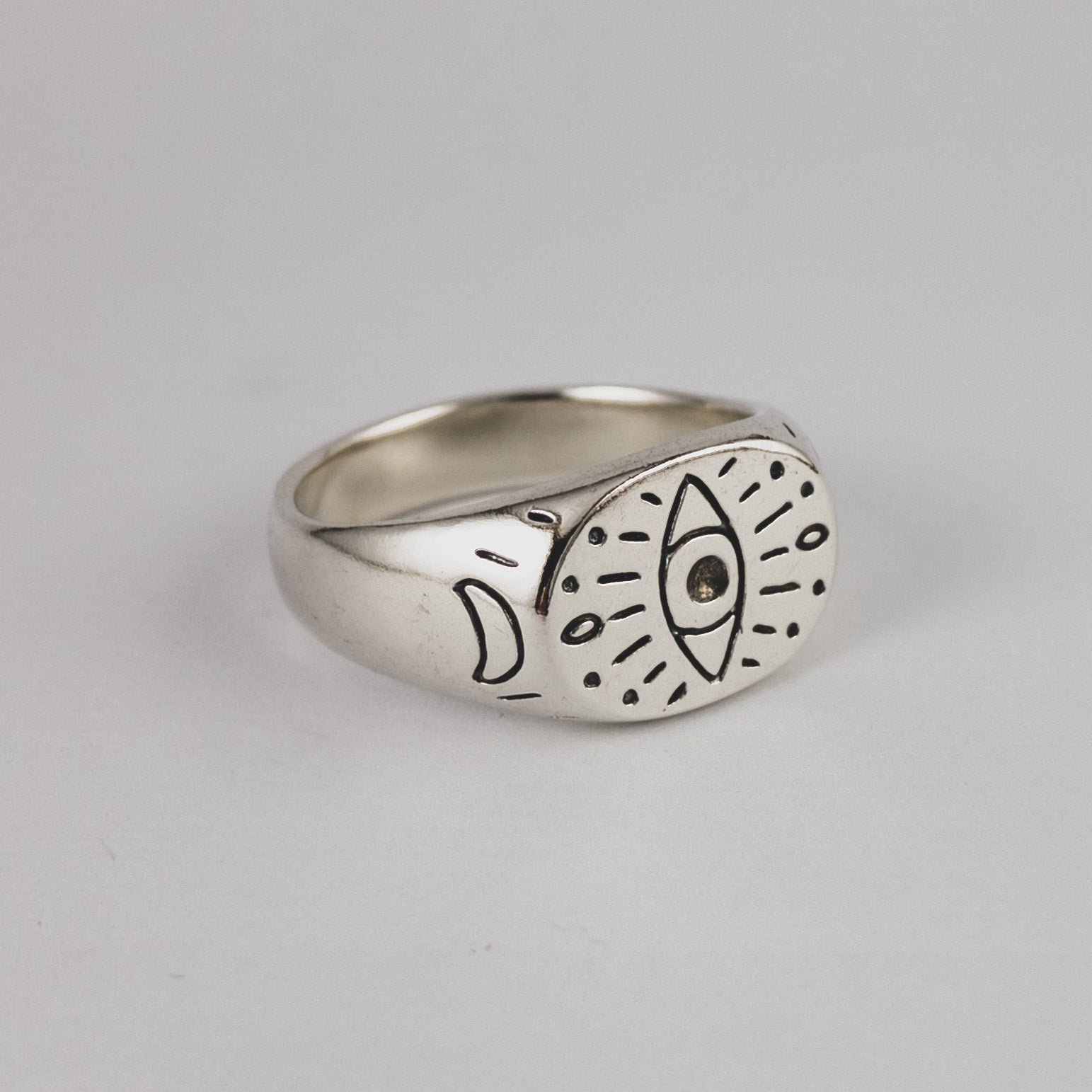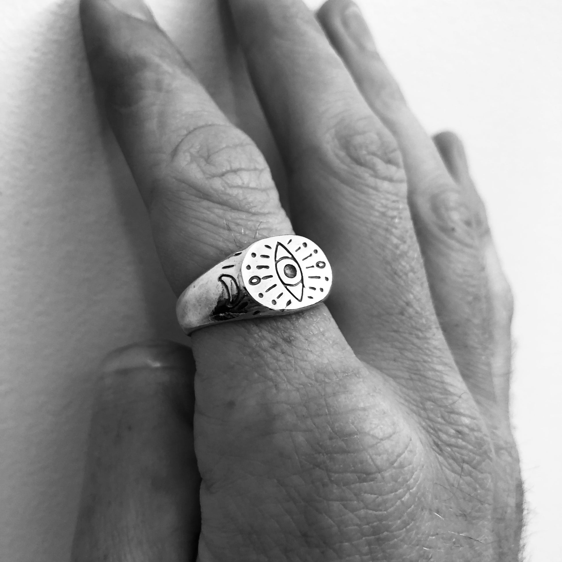 Hand carved and engraved sterling silver ring with oxidised, tumble and hand polish finish.